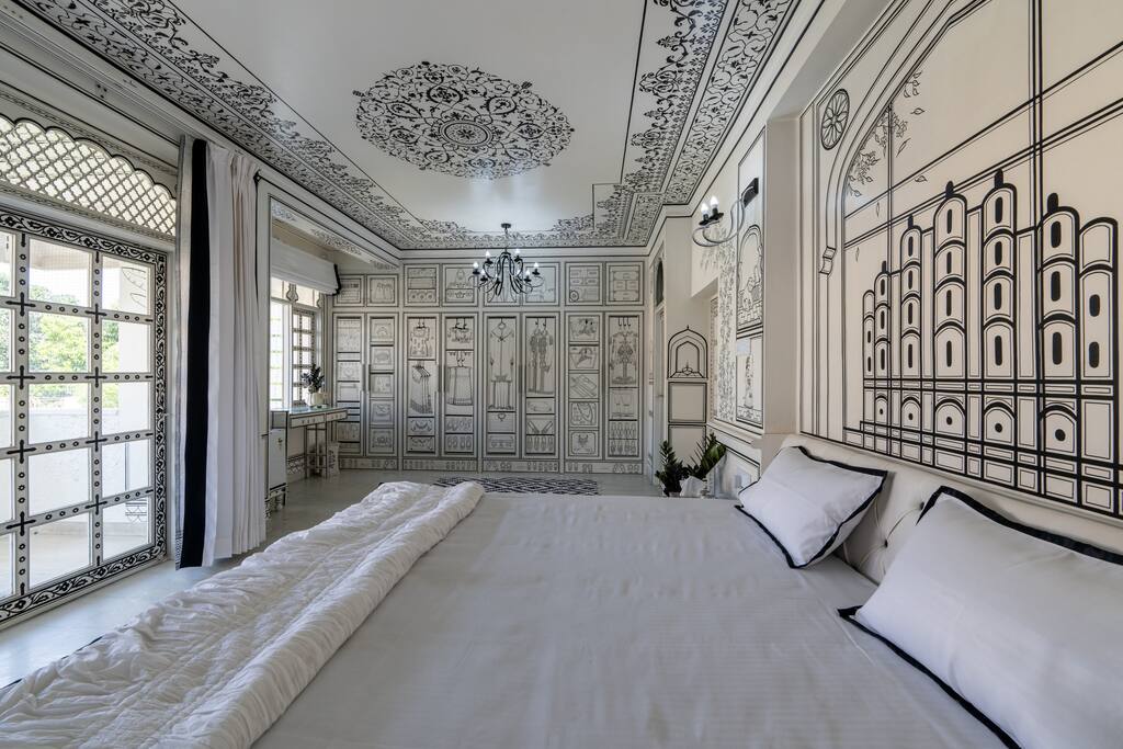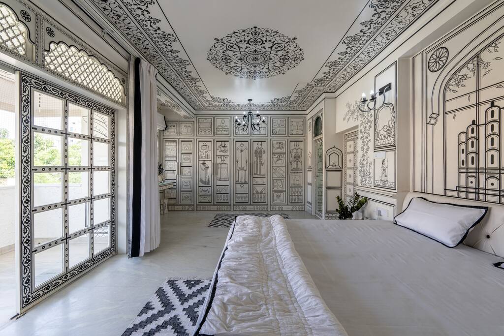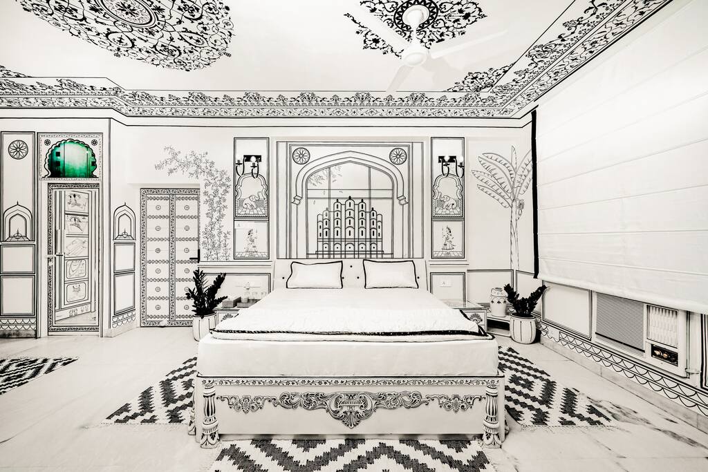 Key Highlights ★ Experience ultimate comfort with a memory foam latex mattress. ★ Effortlessly control curtains through Alexa or remote automation. ★ Stay cool with a powerful 3.3-ton tower AC unit. ★ Enjoy a welcoming ambiance with BBW room fragrance. ★ Slumber in luxury with 300 TMC bed sheets. ★ Rest your head on memory foam pillows for added comfort. ★ Illuminate your space with Alexa-controlled lights. ★ Snuggle under an export-quality duvet for a cozy night. ★ Walk on elegance with handwoven customized carpets. ★ Adorn your windows with customized Bagru print curtains. ★ Create the perfect atmosphere with customized lighting. ★ Manage bathroom lights and exhaust effortlessly with Alexa. ★ Experience Alexa-controlled hot water from the geyser. ★ Illuminate your pantry with Alexa-controlled lights and exhaust. ★ Relax in the living room with Alexa-controlled curtains and lights. ★ Maintain hygiene with BBW hand wash provided. ★ Admire hand-painted Jal Mahal and Hawa Mahal artwork. ★ Marvel at palatial miniature ceiling paintings. ★ Customize your lighting with track lights that rotate 180 degrees and offer three colors. ★ Wrap yourself in luxury with Trident hand and bath towels. ★ Enjoy a stone mat for water soaking in the bathroom. ★ Experience a spa-like shower with body jets and a rain shower (70 lt geyser). ★ Revel in heritage style with customized bathroom tiles. ★ Find convenience with stocked crockery, cutlery, induction, and microwave. ★ Welcome guests with interior-matching doormats. ★ Ensure cleanliness with Takshi chemical cleaning and sanitation. ★ Admire Tanpura-facing clay women, old art tablas, natural Terracotta, Harappa style recreated pots. ★ Simplify lighting control with smart touch switches. ★ Adjust AC settings conveniently with Alexa-controlled infrared technology. ★ Enhance your decor with interior-matching pots and elephants. ★ Bring a touch of nature indoors with black plants.