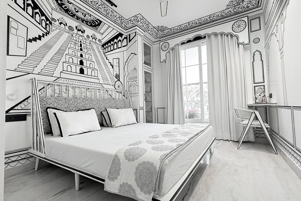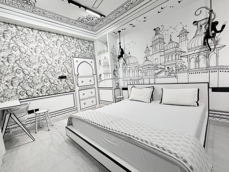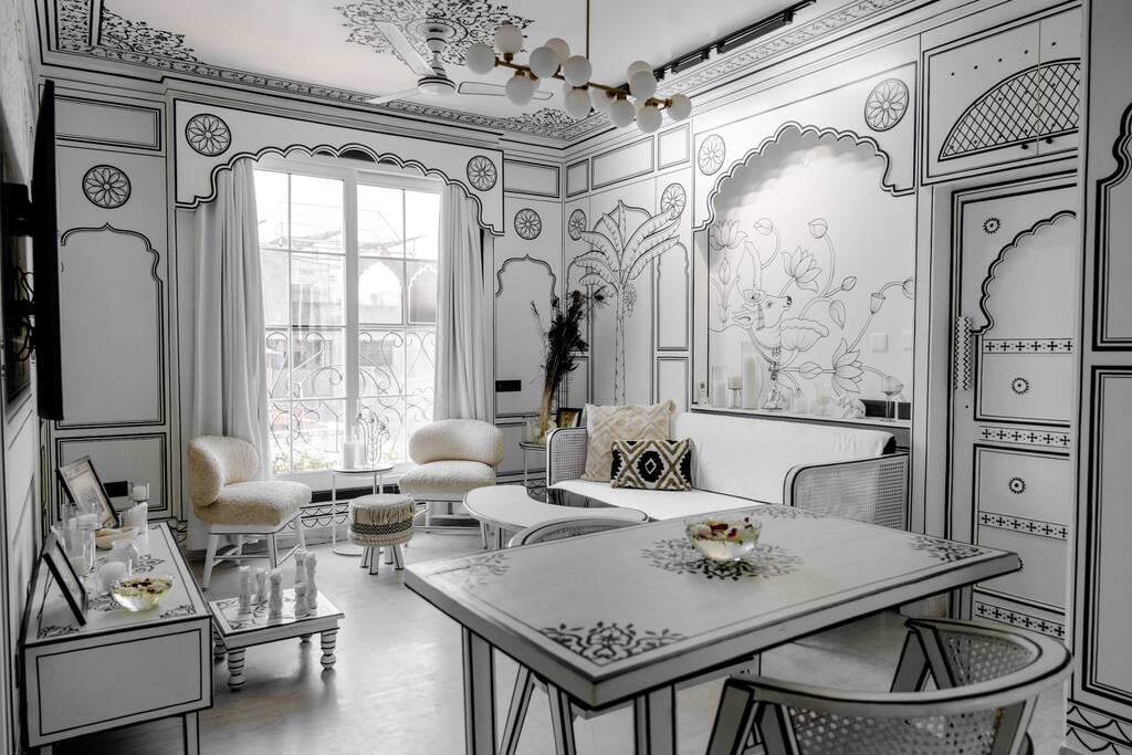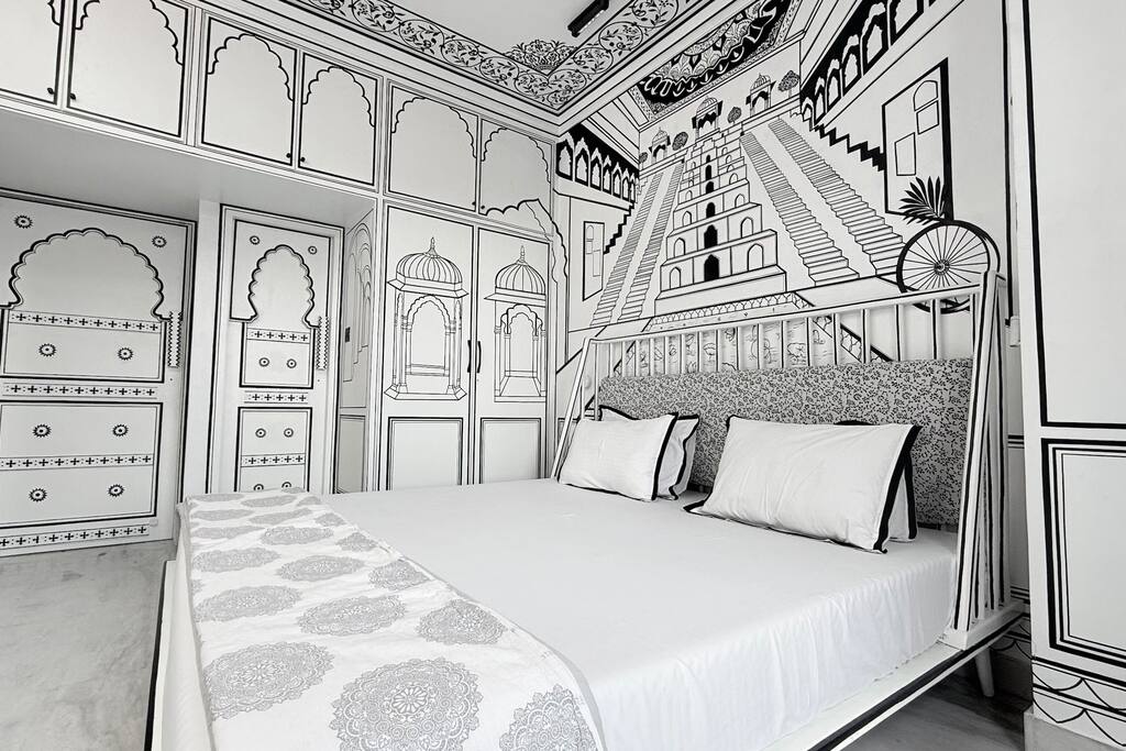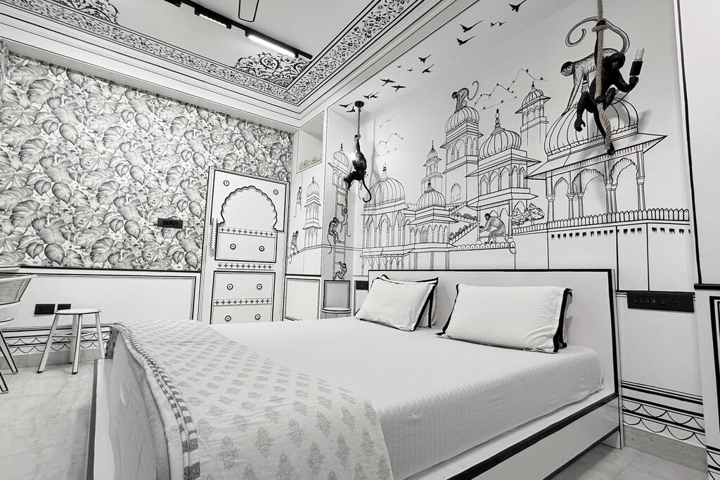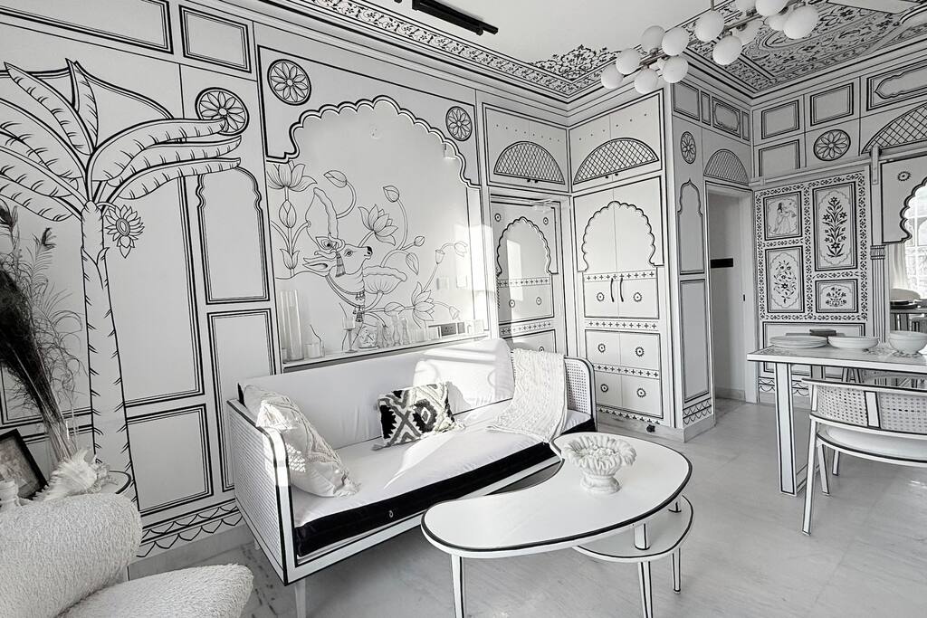 As you step inside, you'll be captivated by living in a sketch of a palace done in Rajasthani miniature art welcoming you with their charm. For those seeking relaxation, a cozy balcony awaits, perfect for sipping your favorite drink. Our thoughtful lighting adjusts to suit your mood. And that's not all – our advanced kitchen is equipped with a high-tech chimney, alkaline water purifier, and even an AC for the cook's comfort. Passion for properties and attention to detail define your experience. Key Highlights ★ Stay hydrated with Maeka Water from Auroville — structured, naturally energized water sourced from sustainable living practices for holistic well-being. ★ Pamper yourself with premium Kimirica toiletries — cruelty-free, plant-based essentials crafted for a spa-like bathing experience. ★ Smart Home Automation: Control your lighting, fans, and television with Alexa voice commands. ★ Premium Touch Controls: Experience the convenience of high-end feather-touch electric switches. ★ Aromatic Home Environment: Elevate your living space with fragrances from Bath & Body Works. ★ Exquisite Furniture Craftsmanship: Enjoy European-standard luxury furniture with soft cotton upholstery, crafted to the highest technical standards. ★ Immersive Cinematic Experience: Immerse yourself in cinematic entertainment on a 65-inch Samsung TV with Alexa integration. ★ Crystal-Clear Views: Enhance your visual experience with argon-filled UPVC windows for exceptional clarity. ★ Serene Greenery: Elevate your ambiance with colorful indoor plants for a soothing touch of nature. ★ Elegant Safety: French balconies in all rooms provide both protection and style. ★ Artistic Wall Decor: Hand-painted wall illustrations of step well and galta monkey temple ! Our gratitude ★ Opulent Slumber: Rest in comfort on a sturdy, luxurious bed with an 8-inch memory foam mattress. ★ Luxurious Bedding: Indulge in the comfort of a soft, plush duvet. ★ Handcrafted Rugs: Experience the warmth and beauty of hand-made organic rugs on your floors. ★ Ambient Lighting: Enjoy diffuser lights that cast a rotating 180-degree glow on your walls, tailored to your mood. ★ Cozy Balcony Retreat: Relax on your balcony with bamboo and sleek metal chairs. ★ Lavish Bathrooms: Italian marble bathrooms feature rain showers and Bath & Body Works hand wash. ★ Plush Towels: Luxuriate in 750-gram Trident towels. ★ Fully Equipped Kitchen: Your kitchen is complete with an Elica chimney, premium French cutlery, Marks and Spencer crockery, microwave, and induction cooktop. ★ High-Speed Connectivity: Stay connected with a 100 Mbps Wi-Fi connection. ★ Elegant Dining: Gather around a comfortable dining table for four. Guests would have access to the entire place as described in the listing The host is just a message away and he will arrange for any required assistance The place is located on 2nd floor and is accessible by stairs only. We do not have an elevator at our place. One common bathroom serves both room is featured with a 100 litre geyser for uninterrupted hot water supply CANDLE LIGHT DECOR EXPERIENCE — create your space magical (for pricing get in touch with us)